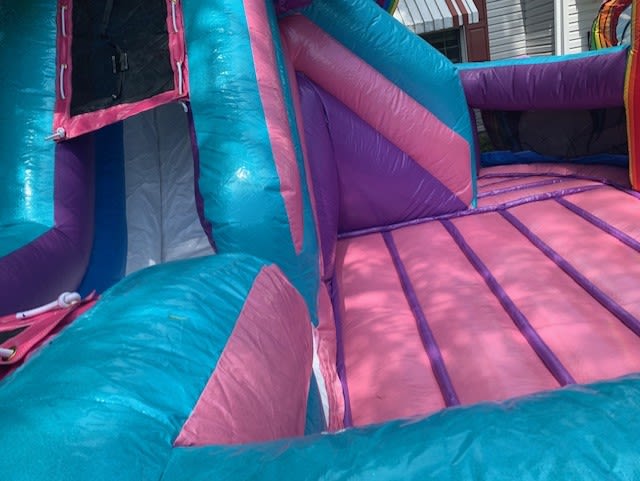 One of our newest additons, this beautiful Unicorn bounce house is called the Unicorn Playland. It features impressive unicorn graphic in the front, a climb area, slide, jumping area, glittery vinyl and much more, be one of the first to book this awesome unicorn inflatable bounce house. It features dazzling sparkle fabric, and can be used both with or without water. Has spacious bouncing areas
