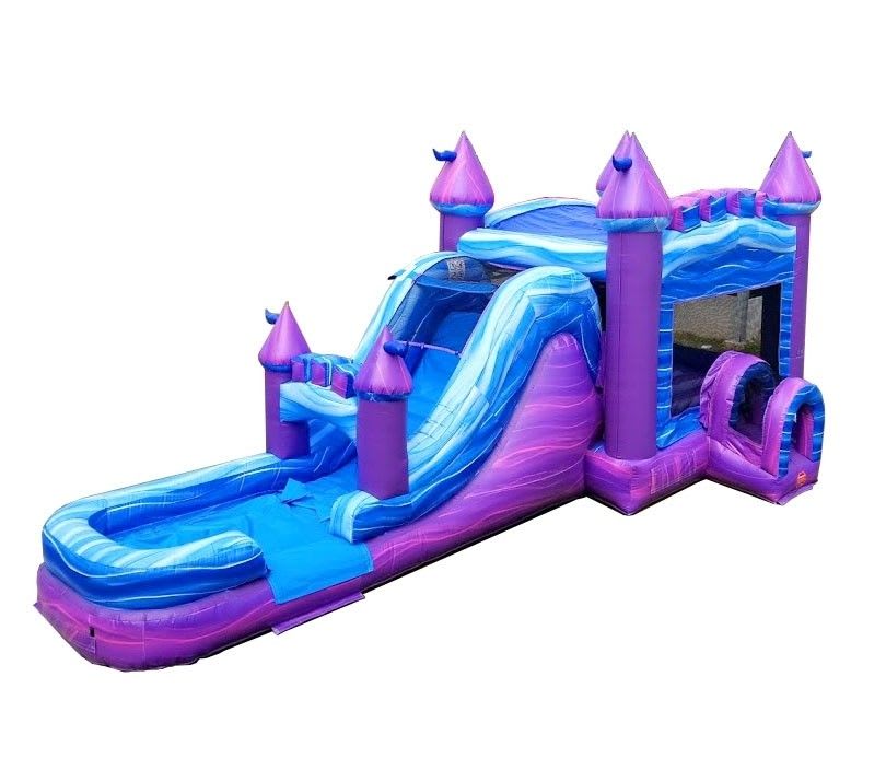 Take the fun and excitement of jumping and playing in a waterslide bounce house and MEGA SIZE it with the Purple Mega Castle wet/dry Combo! From their bright, vibrant colors, to the spacious bouncing area and incredibly fun big slide, kids can't help but look at these units in awe. This unit stretches out for 32' feet of fun, exciting activities that may even have a few parents secretly wanting to jump in! Crawl into the bouncing area through our upgraded, enclosed tunnel entrance. Have a blast jumping, bouncing and laughing the day away on this mega bouncer! Climb up the short rock climb wall to get a view of the flowing water down the slide. Get ready, then head down into the splash pool at the bottom for a grand finale and some photos for the scrapbook! The Purple Mega Castle Combo brings everything needed to the party to have a great time, and fill it with all the joy that kids (and adults!) want on a fun, exciting and memorable play day.