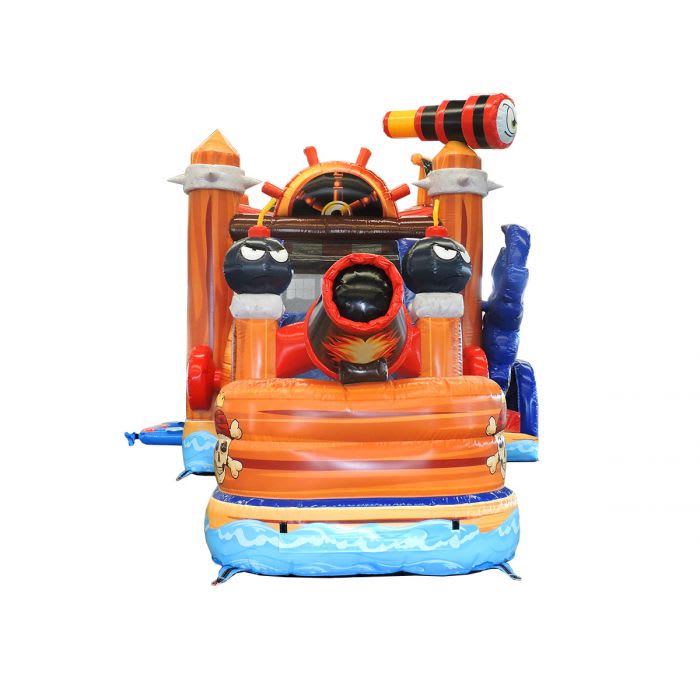 Take the fun and excitement of jumping and playing in a water slide bounce house and MEGA SIZE it with the ALL NEW Mega Pirate Ship Water Slide Bounce House Combo! This amazing inflatable is covered from front to back in Pirate Ship accents that are certain to dazzle kids and adults once they lay eyes on it. We know we did! From the bright, vibrant colors, a fun, whimsical design, to the spacious bouncing area and incredibly fun big slide, kids can't help but look at these units in awe. This unit stretches out for 32' feet of fun, exciting activities that may even have a few parents secretly wanting to jump in! Crawl into the bouncing area through our upgraded, enclosed tunnel entrance. Have a blast jumping, bouncing, and laughing the day away on this mega bouncer! Climb up the short rock climb wall to get a view of the flowing water down the slide. Get ready, then head down into the splash pool at the bottom for a grand finale and some photos for the scrapbook! The Mega Pirate Ship Water Slide Bounce House Combo brings everything needed to the party to have a great time, and fill it with all the joy that kids (and adults!) want on a fun, exciting, and memorable play day.